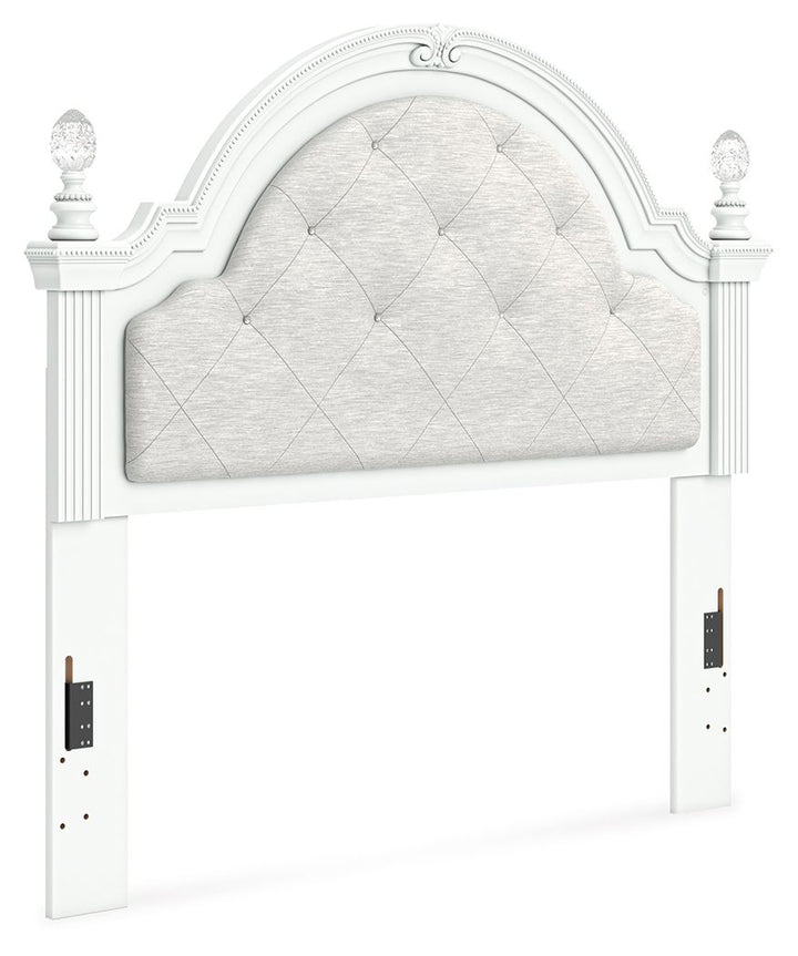 Fit for a princess. This full upholstered panel headboard’s crisp matte white finish pairs with charming ornate beading and sumptuous button-tufted upholstery—perfect for your girly girl. Decorative ball tops and multicolored LED lighting are the crowning touches to make your little one feel like royalty.