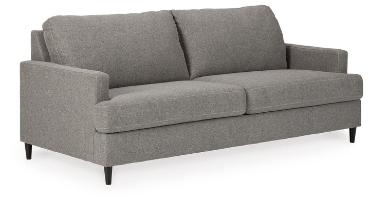 Mixing mid-century inspiration with modern attitude, this sofa is as retro chic as it is fashion forward. Loaded with multi-tonal interest, the granite gray upholstery is the essence of earthy elegance. Design elements include 2-over-2 cushion styling, t-cushions wrapping around slim track arms and tapered accent legs that are right on point.