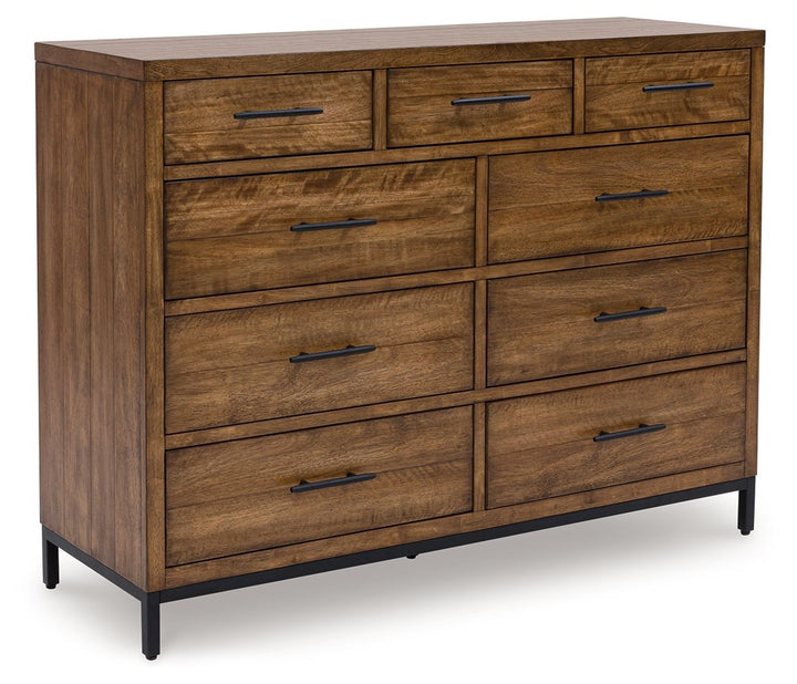 Cool, chic and crafted for the everyday, this dresser is well-suited to your urban contemporary character. It pairs the natural beauty of wood with black metal for a luxe industrial feel. And with nine sturdy drawers, sleek bedroom storage is nearly effortless. How’s that for relaxed refinement?