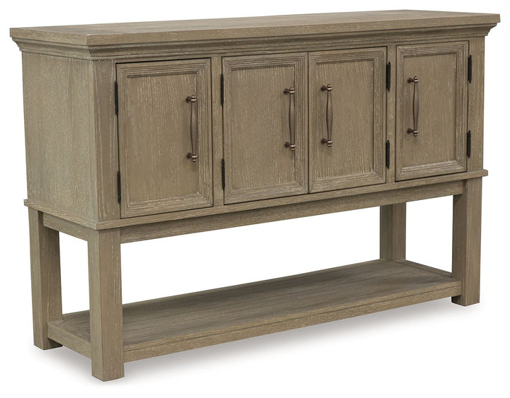 Indulge in relaxed refinement with this dining server. Generously scaled moulding details and a light grayish brown finish exemplify an updated take on traditional styling. Thanks to its versatile functionality, this four-door piece effortlessly works as a sideboard, entryway table or TV stand. Now there’s a show of great taste—no matter where you place it.